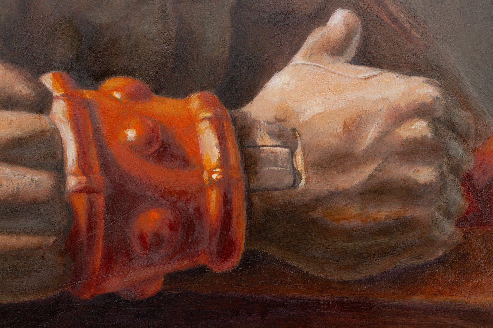 Where Rembrandt is flaunting his garments, He-Man is flexing his plastic muscles. Rembrandt, in turn, borrowed this composition from Titian. I find the bright cadmium yellow of the plastic hair an interesting addition, since Rembrandt didn't have access to this paint. It makes for a strong contrast with Rembrandt's original.