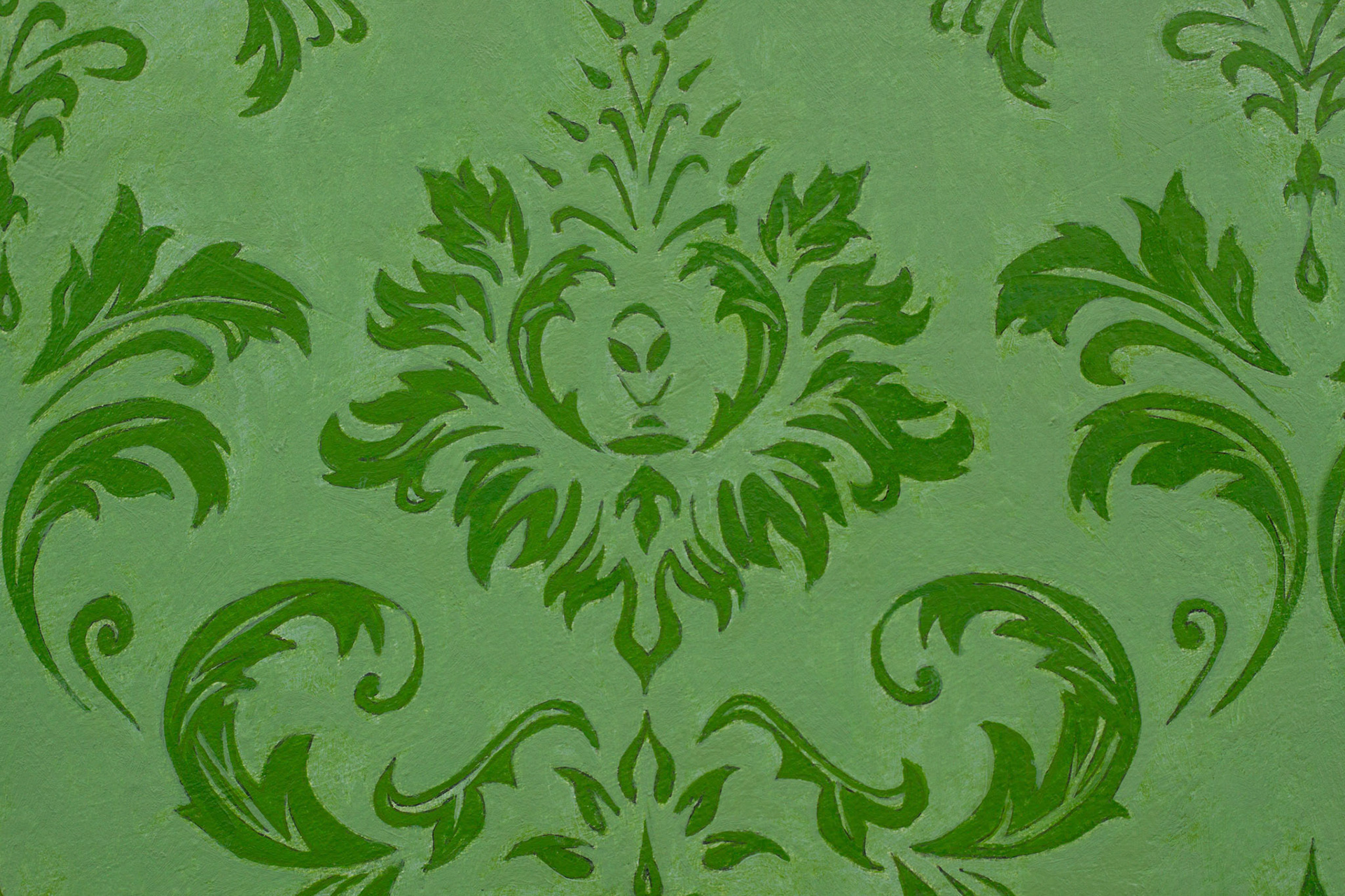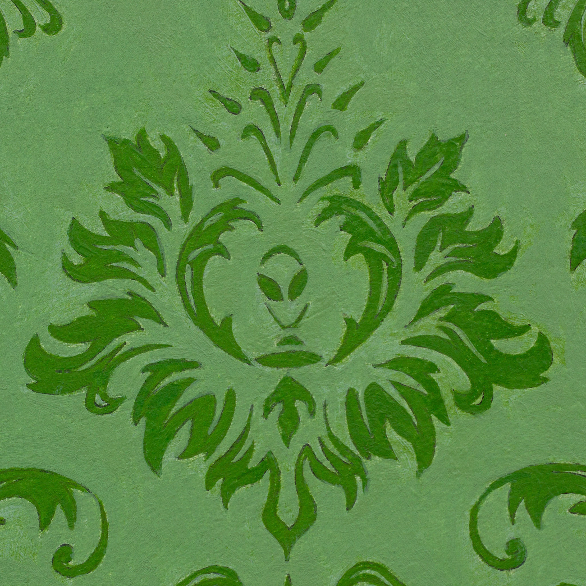 When working on the design of the wallpaper, I found it becoming too kitschy. I decided to replace the pine cone in the middle of the design with an alien portrait and a little UFO.